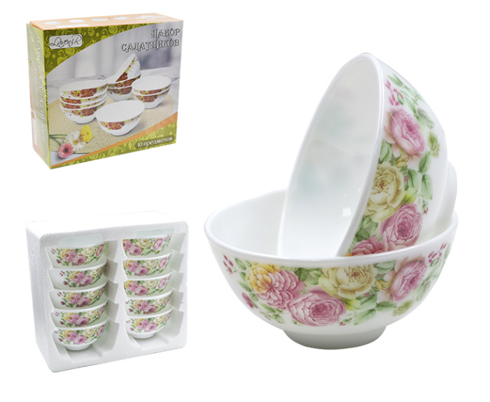 Набор салатников (10пр.) Lavenir "Чайные розы" 250 мл, 11 см, 4,5" 10PCS YF20032 стеклокер.